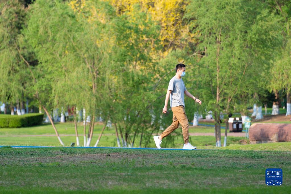 5月19日,市民在哈尔滨市香坊区一公园散步。