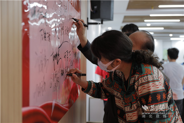 参会人员在“喜迎二十大,说说新变化”“我倡议、我参与”签字板上签名。 通讯员供图