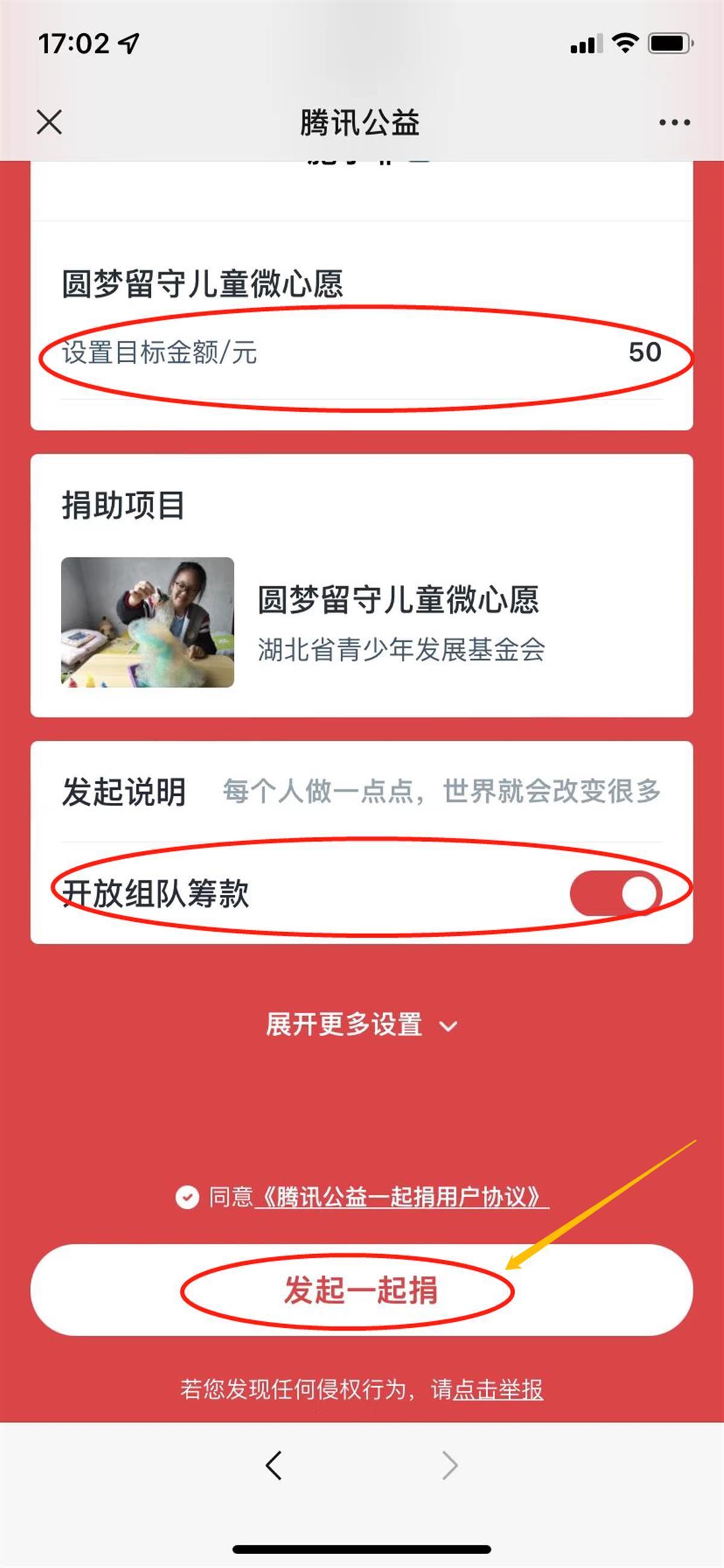 输入发起者名称,“一起捐”发起者要填写清楚市县、单位以便统计核对(**市**县**单位或组织),凡不能明确发起的“一起捐”主体的资金将由省青基会统筹;设置目标金额、开放组队筹款,确认后点击“发起一起捐”。
