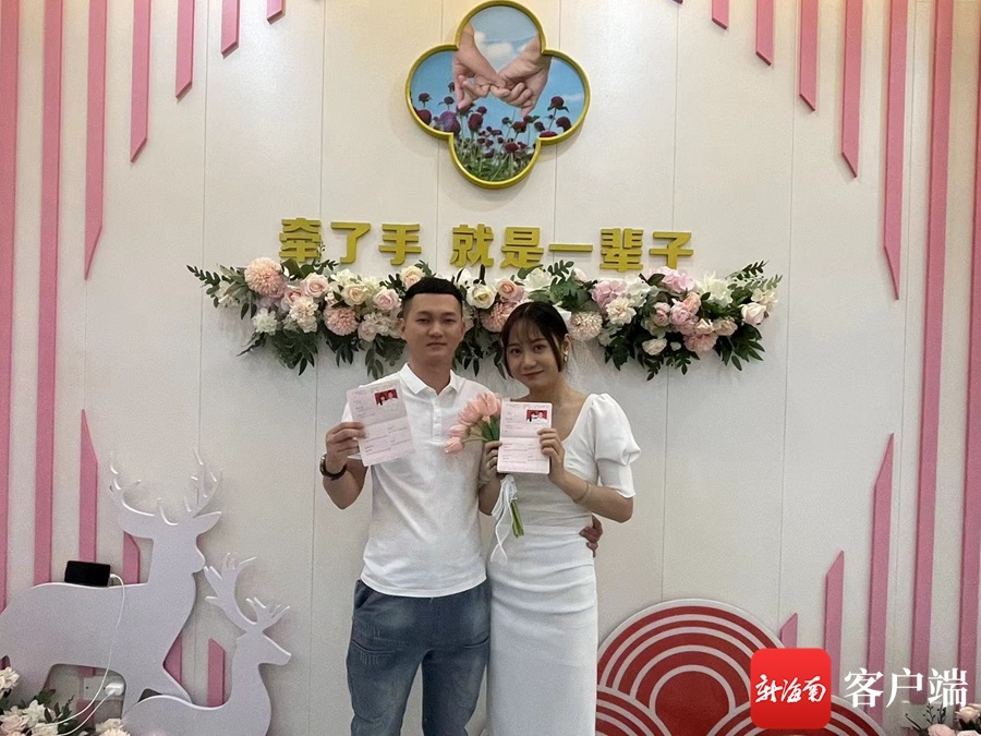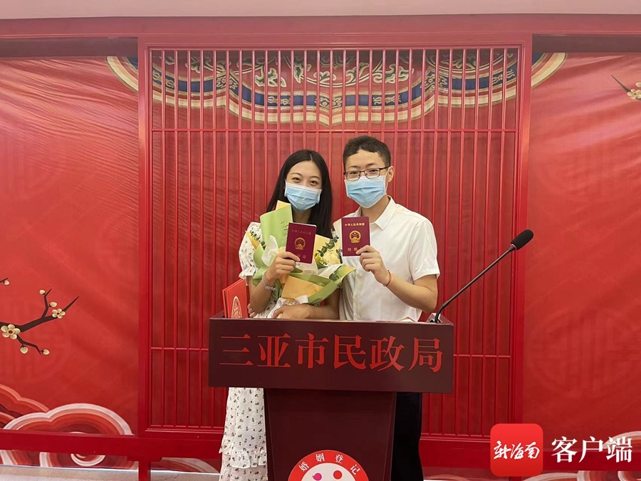 “我们提前了20天左右在公众号上面预约的,工作人员都很热情,从进门开始就一直引导我们,办理证件也很快,现在我也是有红本本的人了。”在三亚市民政局婚姻登记处,市民何先生和付女士已经办理好登记手续,准备前往颁证厅。