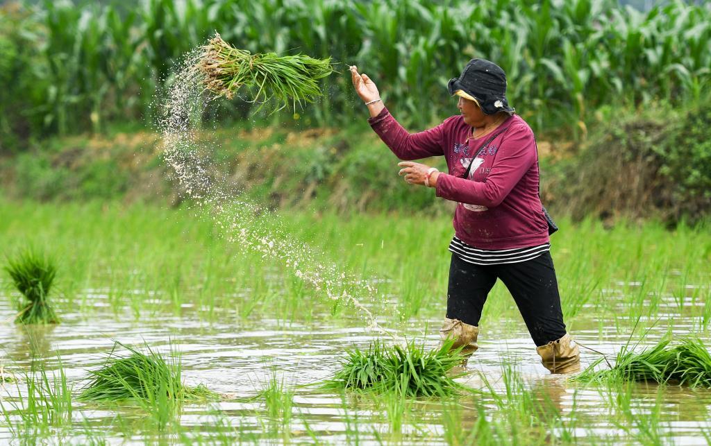 5月20日,在四川省南充市蓬安县睦坝镇虹管村,村民在田地抛秧。新华社发(刘永红摄)