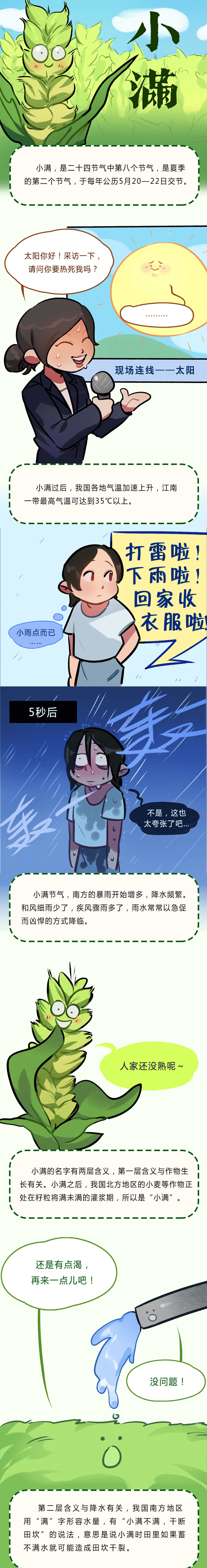 “四月中,小满者,物致于此小得盈满。”小满时节,麦类等夏熟作物正值生长旺季,籽粒灌浆渐趋饱满,却尚未成熟,只算得上“小得盈满”,故称作小满。