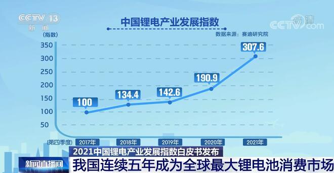 央视网消息:工业和信息化部赛迪研究院近日发布2021中国锂电产业发展指数白皮书。该指数从市场、资本、创新、供给等多个维度选取典型指标,量化分析全国锂电产业发展的规模和水平。白皮书显示,2021年第四季度中国锂电产业发展指数达到307.6,是2017年的三倍多。