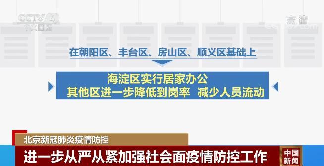 徐和建还介绍,北京将进一步从严从紧加强社会面疫情防控工作,包括:在朝阳区、丰台区、房山区、顺义区基础上,海淀区实行居家办公,其他区进一步降低到岗率,减少人员流动。确需到岗的,持48小时内核酸检测阴性证明,实行家庭单位“点对点”闭环管理。