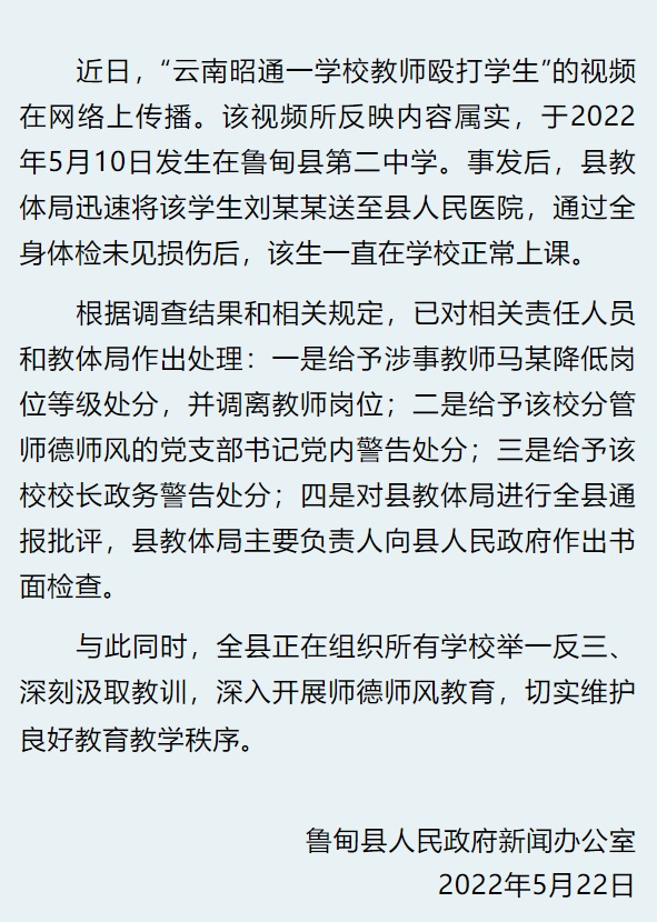 日前,云南省昭通市一所中学的教师殴打学生的视频引发社会关注。视频画面显示,一名男教师揪住一名男学生的头发不停摇晃,并一把将学生从座位上拉下倒地,该学生还被男教师踢了几脚。随即,该名教师将学生拉拽到教室大门处,踢了一脚后将学生赶了出去。之后,当地有关部门回应,涉事教师已被处理。