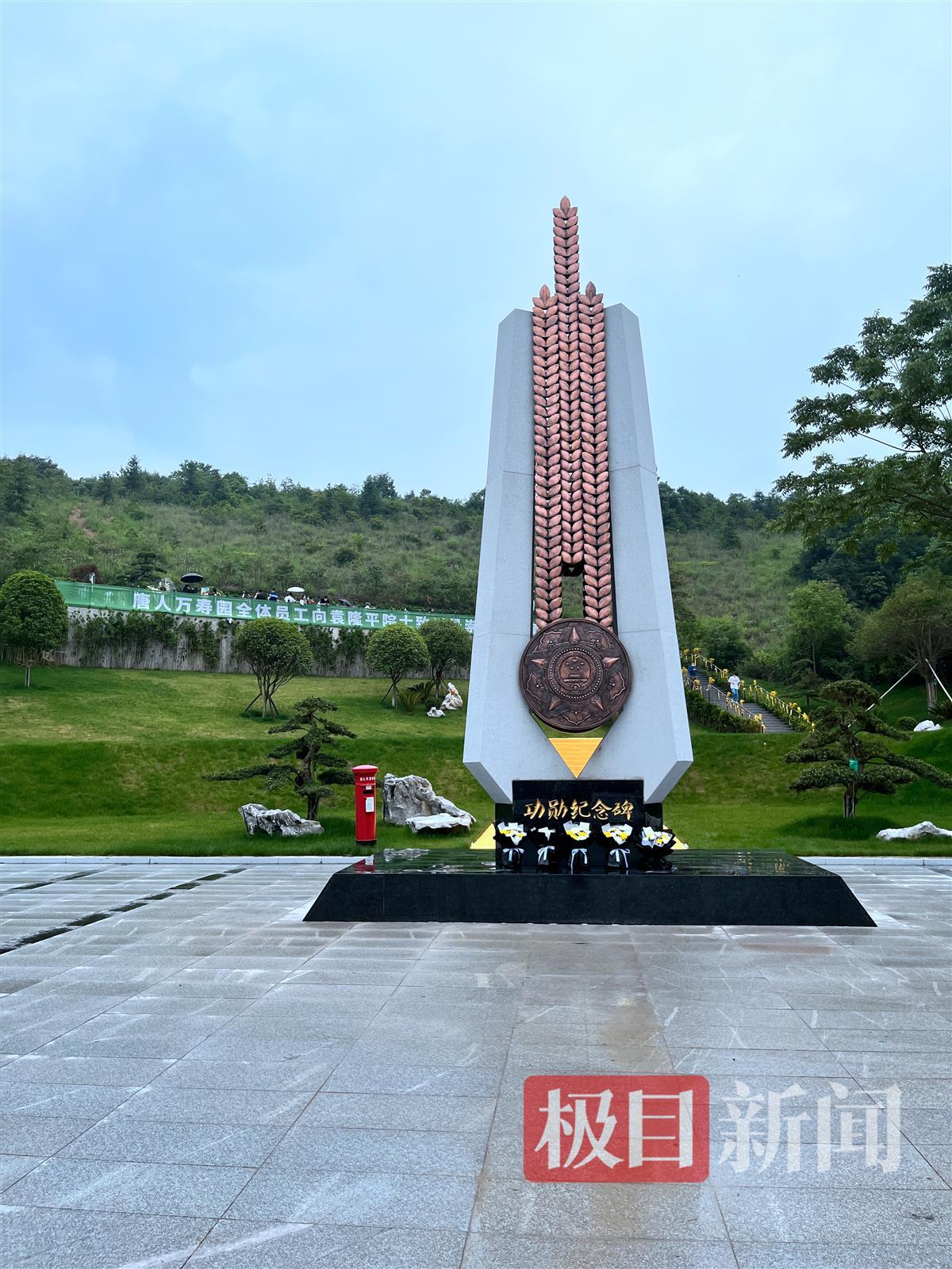 上午8时许,不少市民已经来到袁老的功勋纪念碑前,向袁老致敬默哀。极目新闻记者看到,纪念碑主体部分造型由“稻穗”和“共和国勋章”组合而成,纪念碑前已经摆满了鲜花。袁老的安葬地就在纪念碑后方不远处,工作人员在通往袁老墓前的楼梯扶手上,装饰了一束束金黄的稻穗。