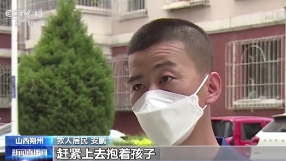 救人居民 安鹏:看到那个小孩在慢慢一点一点往下掉,特别危险。所以第一个想法,赶紧上去抱着孩子,因为孩子当时在哭。