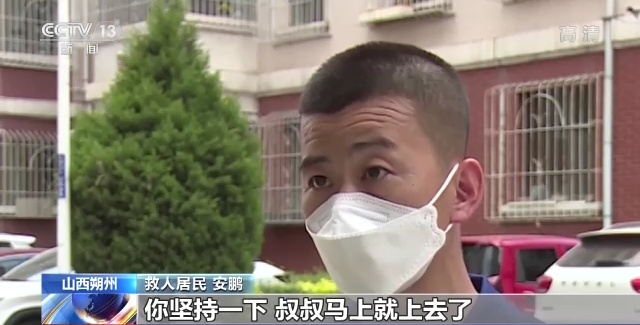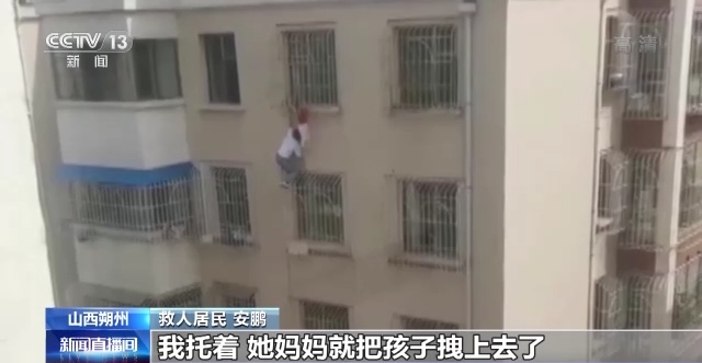 救人居民 安鹏:孩子一直在喊爸爸和妈妈,我一边爬那个窗户,一边我说,你坚持一下,叔叔马上就上去了,上去以后就托住她。大概十几分钟她妈妈回来以后,我托着,她妈妈就把孩子拽上去了。