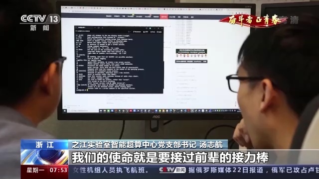 之江实验室智能超算中心党支部书记 汤志航:也不是没有过气馁。但想想当年老一辈科学家仅靠手摇计算机,甚至算盘就算出了原子弹的理论模型。今天我们国家已经建成了像神威、天河这些超级计算中心。我们的使命就是要接过前辈的接力棒,加快构建世界领先的智能超算算力,实现智能计算的“中国定义”。
