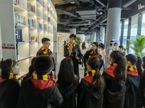 孩子们在青教志愿队老师的带领下,开展丰富多彩的读书活动。在哈利·波特主题书屋,全国最美教师、钢花小学教师华雨辰和同事陈晨、鮑鑫,以及武钢三中教师陈建树化身霍格沃兹魔法学校教师,带领孩子们穿着魔法服,挥动魔法杖,领取人物任务,沉浸式体验由青教志愿队改编的“图书馆里的剧本”系列之《霍格沃兹的阴谋》,跟着剧本走进书中的魔法世界,充分享受读书的快乐。