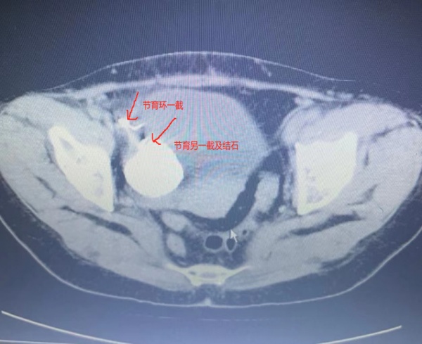 “普通的节育环移位不会伴随尿频尿痛症状多年,陈女士身上可能还存在其他没有发现的问题。”入院后,妇科主任刘海琳及副主任熊志芳第一时间安排陈女士做了腹部盆腔CT检查。检查结果提示:节育环的一端位于膀胱外,另一端位于膀胱内。棘手的是,膀胱内还存在4厘米的大结石与节育环融合。