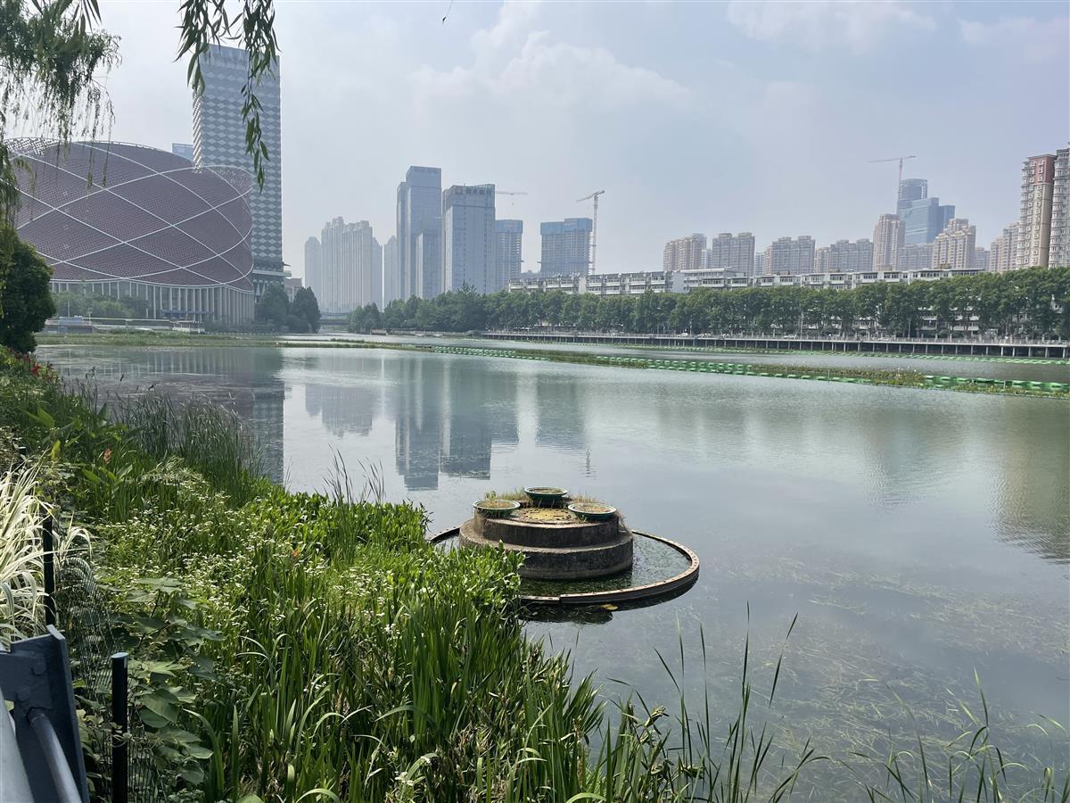 5月23日,极目新闻记者来到水果湖。在湖岸旁,可以清晰地看到湖里的水草。湖心有连片的绿色围挡,围挡内种植着几排水生植物。