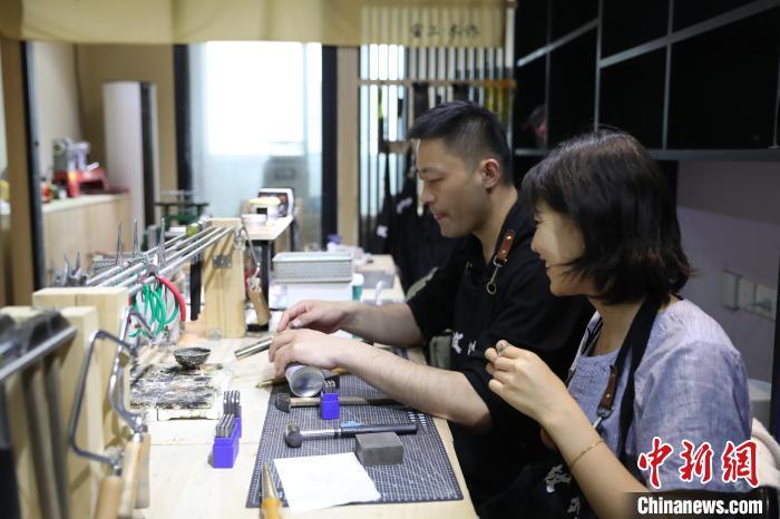 一对情侣正在制作手工戒指。 于晶 摄