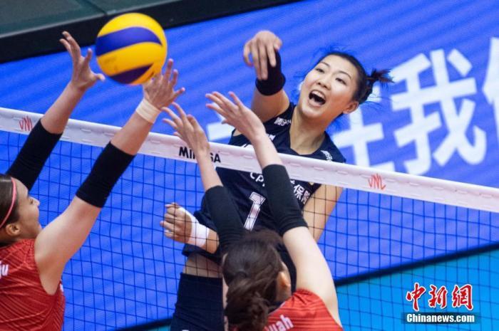 资料图:袁心玥(蓝衣者)在扣球。中新社记者 钟欣 摄
