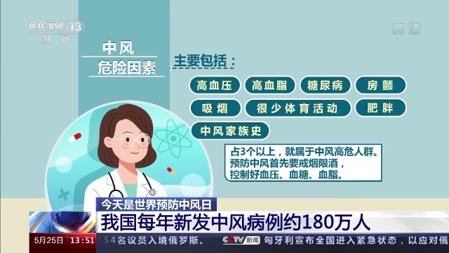 今天(5月25日)为世界预防中风日。中风又称脑卒中,我国每年新发病例大约180万人,并以每年8.3%的速度增长。