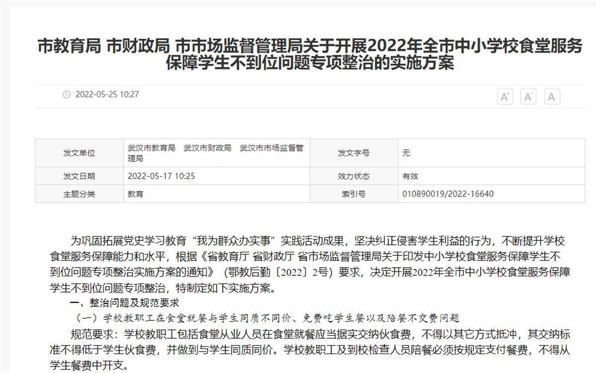 湖北日报讯(记者张倩倩)5月25日,武汉市教育局官网发布《关于开展2022年全市中小学校食堂服务保障学生不到位问题专项整治的实施方案》(以下简称《方案》),坚决纠正侵害学生利益的行为,不断提升学校食堂服务保障能力和水平。