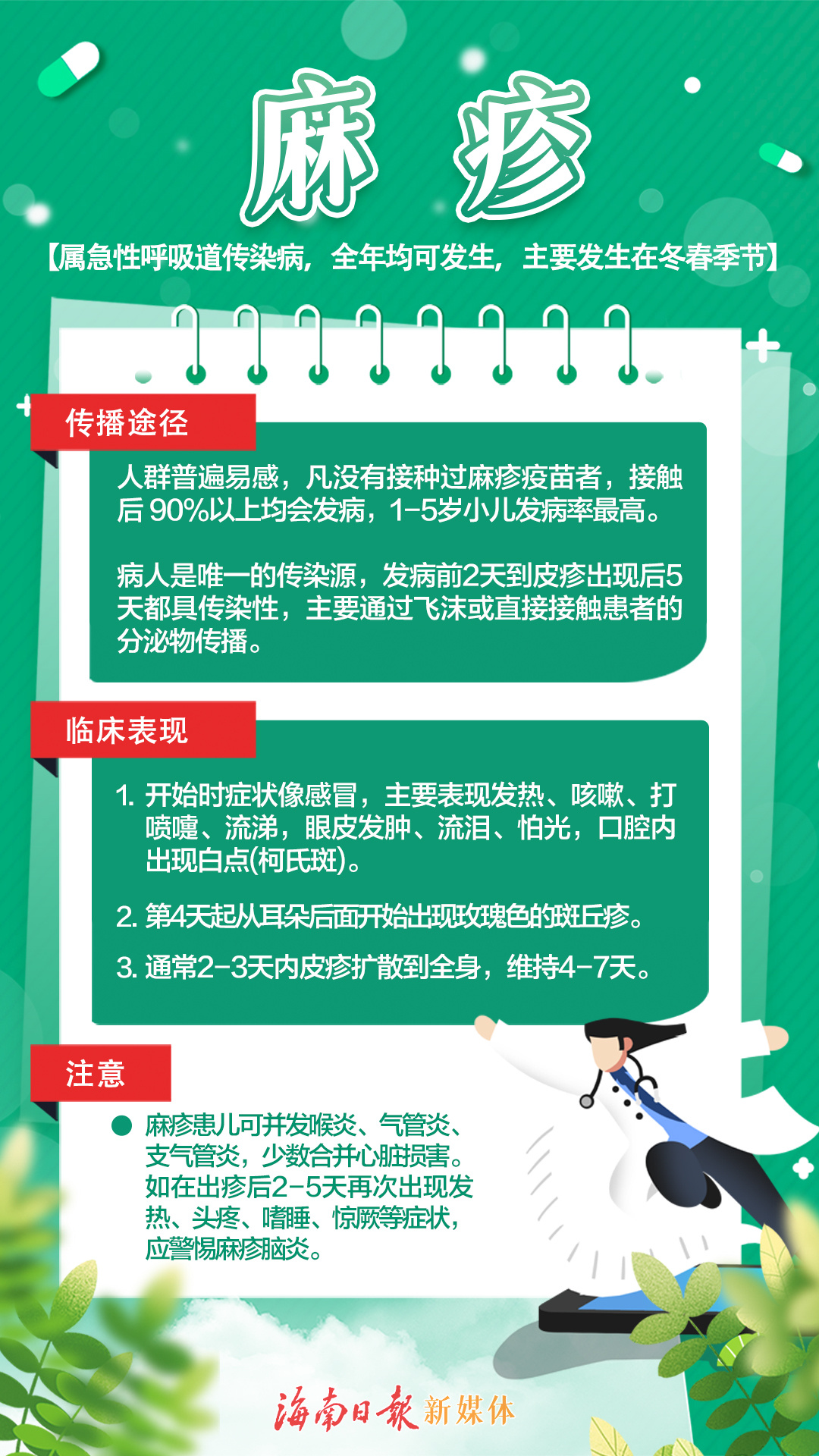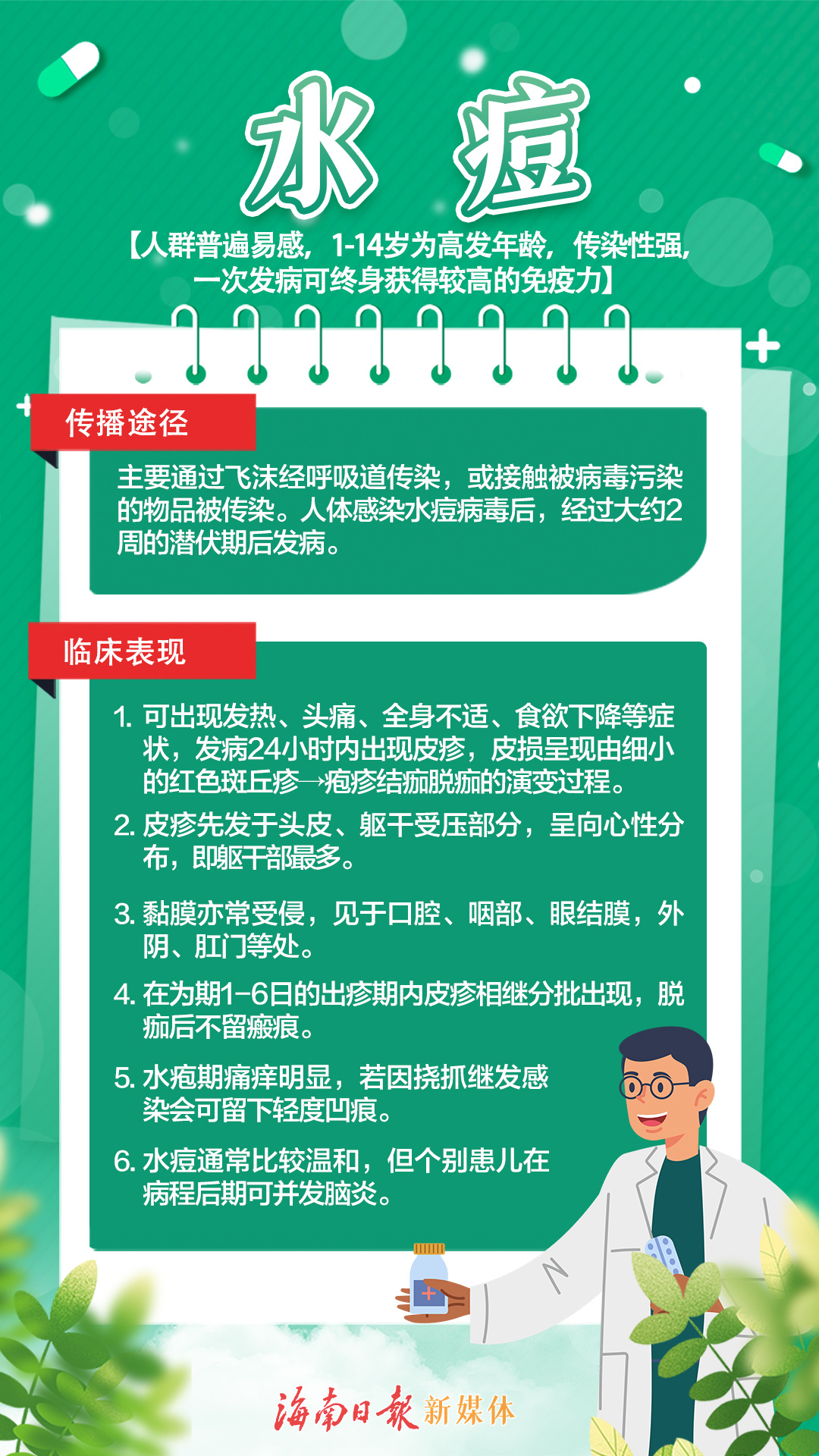 流感、麻疹、水痘等儿童常见传染病也在这时来凑热闹了!不同传染病的临床表现都是啥?怎样科学有效预防?海南日报新媒体中心小编整理了海南春夏季常见的几种儿童传染病,用一组海报带你快速了解疾病本身以及防治知识↓↓戳图了解!