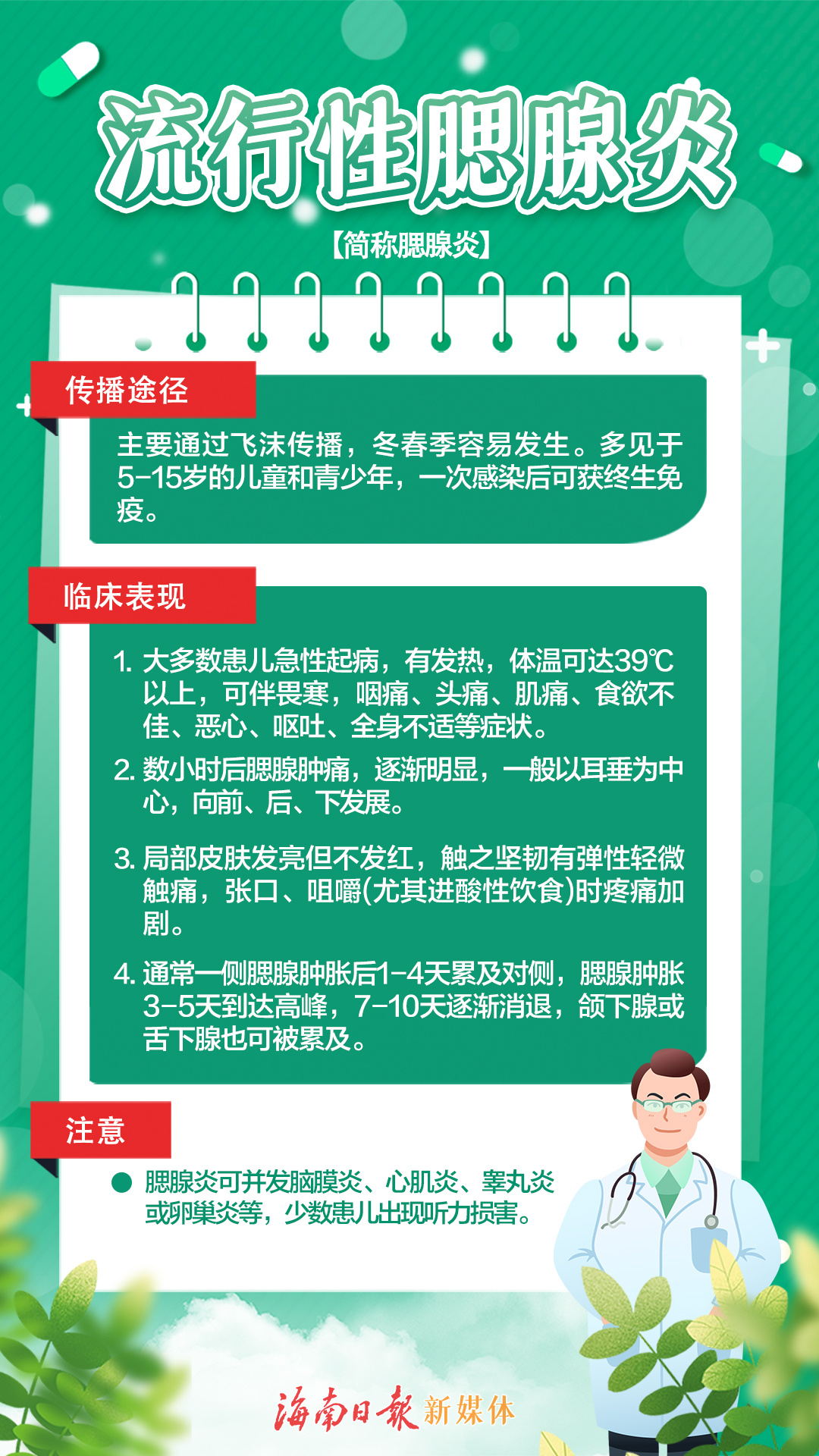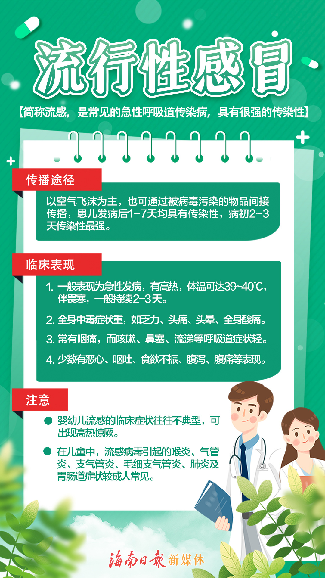 曾雪霞表示,流行性感冒简称流感,有季节性,海南省流感流行季一般是上一年11月~当年3月,个别年份持续至7月。主要通过患者咳嗽和打喷嚏等以飞沫方式传播,也可通过口腔、鼻腔、眼睛等黏膜直接或间接接触传播。典型的季节性流感大多突然发病。在学校、托幼机构和养老机构等人群密集的场所易发生聚集性疫情。