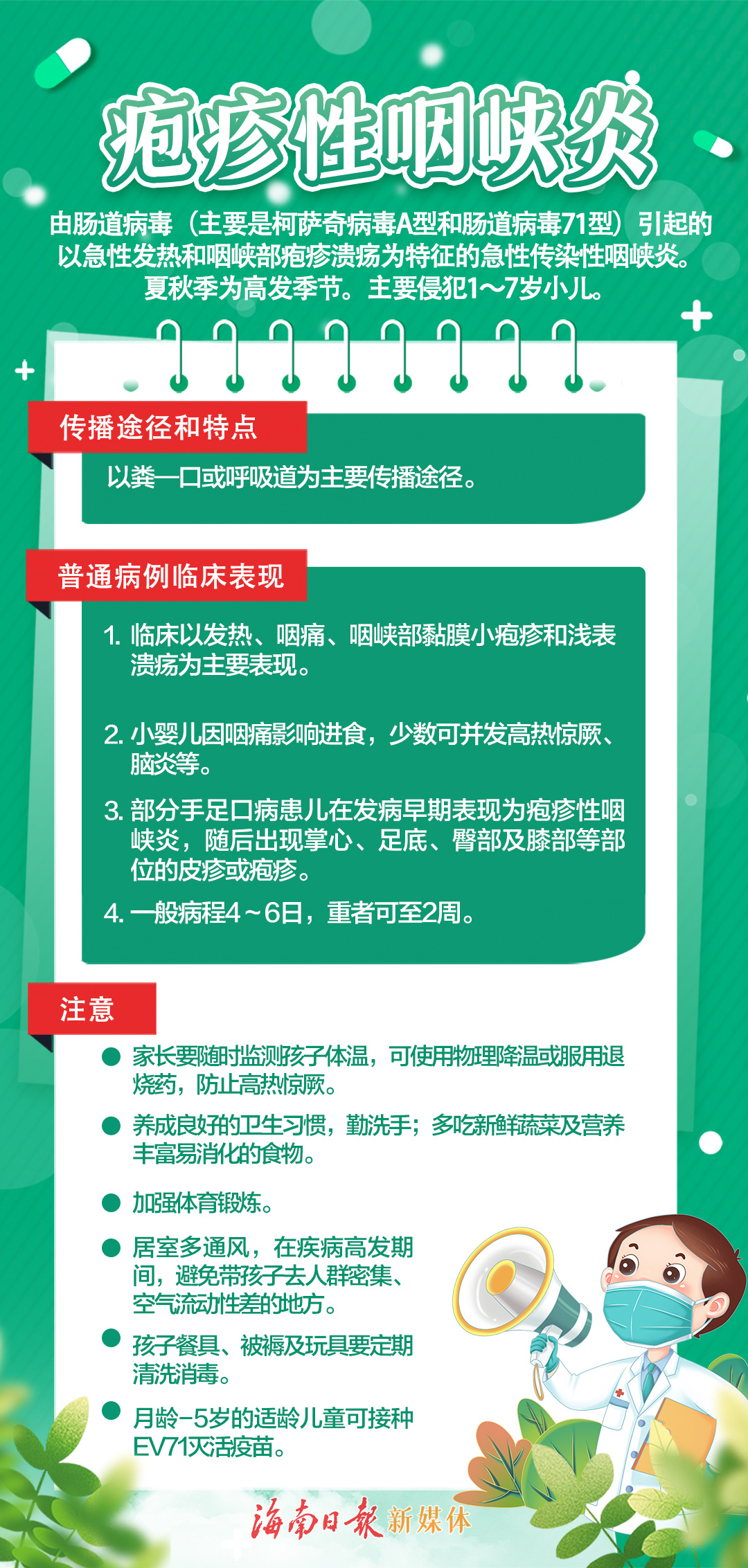 进入夏季后,海南天气炎热,湿度增大,一些常见的呼吸道传染病和消化道传染病已开始进入发病的季节,甚至已经出现高发的趋势,应做好常见传染病的防控,保护孩子和人民群众的身体健康。