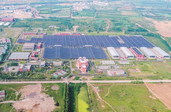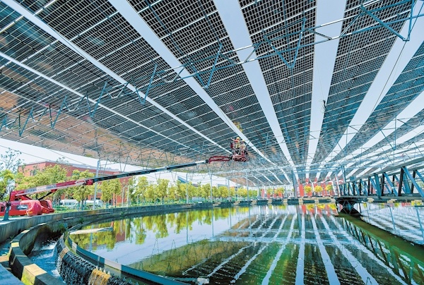北湖污水厂面积大、周边空旷、光照充足,具备光伏发电的优势。从空中俯瞰,污水厂犹如戴上一顶漂亮的帽子,遮挡住大部分光照,但并不影响污水处理的工艺和效果。一片片光伏板遮挡住烈日,也为夏日里例行巡查的工人营造出丝丝清凉。