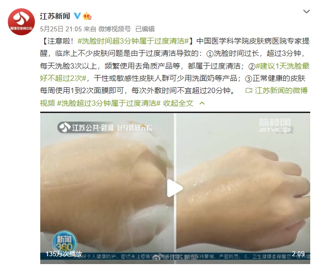 【注意啦!洗脸时间超3分钟属于过度清洁】中国医学科学院皮肤病医院专家提醒,临床上不少皮肤问题是由于过度清洁导致的:①洗脸时间过长,超过3分钟,每天洗脸3次以上,频繁使用去角质产品等,都属于过度清洁;②建议1天洗脸最好不超过2次,干性或敏感性皮肤人群可少用洗面奶等产品;③正常健康的皮肤每周使用1到2次面膜即可,每次外敷时间不宜超过20分钟。