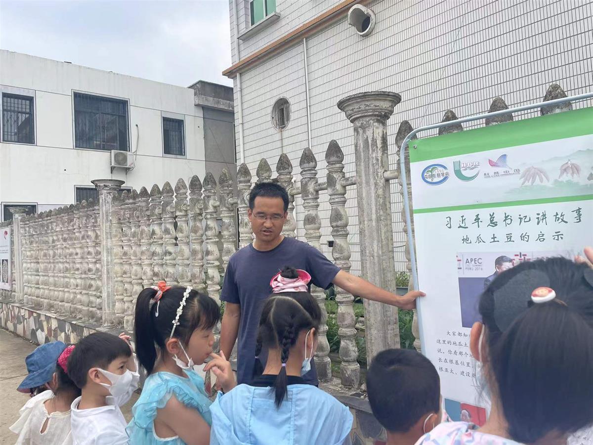接着,王连军带着小朋友们参观了红薯实验田。他引用《九品芝麻官》、《神探包青天》等剧作中的桥段、台词,为在场学生及家长讲解了红薯在我国的种植历史,培育红薯的战略地位、食用红薯的保健功效和农科院培育红薯的品种分类。在此过程中,王连军还给每个小朋友分发了两颗新育成的红薯,并讲授了培育红薯苕尖的方法。