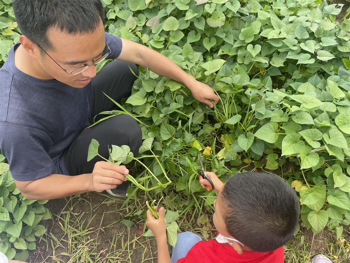 “大家认为什么样的红薯苗是优质的?”“好吃的!”“好看的!”“多的!”王老师在田垅旁向小朋友介绍了农科院11号红薯“品相好、口味佳、产量大、抗病性高、萌芽性好、储藏性久”等特性,指导小朋友拿着专用的剪子和家长一起采摘了烹饪食用的红薯苗和土培育苗的红薯苗,每人都收获满满。