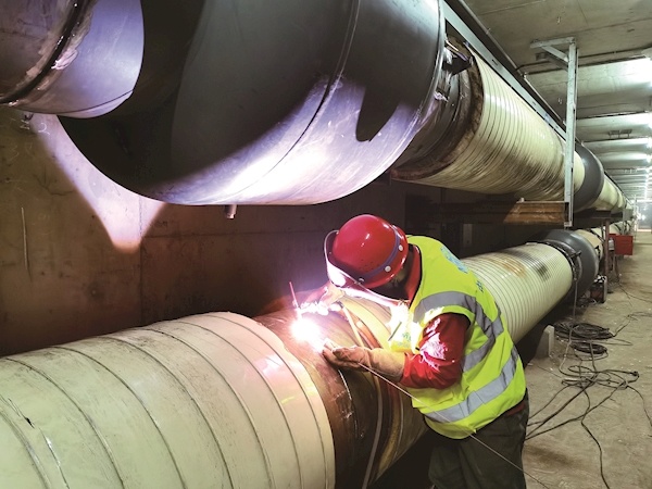 工人刘师傅告诉记者,敷设安装的热力管道大小不一,每段管道长6米,直径为600至1000毫米不等。“厚壁大管道管口的焊接采用多层多道焊,多层多道焊缝时会逐层检查,合格后方可焊接次层,直至完成,目前我们正以每周完成200米段的速度推进,力争今年6月完成施工任务。”
