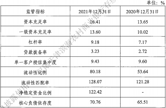截至2021年末,天津滨海农商银行资本充足率为16.41%,一级资本充足率为13.60%。