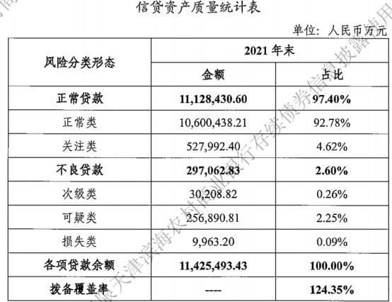 截至2021年末,天津滨海农商银行各项贷款余额为1142.55亿元,其中,不良贷款为29.71亿元,占比为2.60%,拨备覆盖率为124.35%。