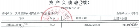 截至2021年末,天津滨海农商银行应付职工薪酬为2.66亿元,上年末为2.48亿元。