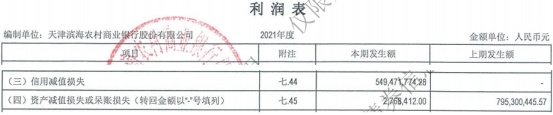 2021年,天津滨海农商银行信用减值损失为5.49亿元;资产减值损失或呆账损失为276.84万元,上年同期为7.95亿元。