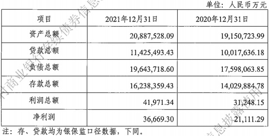截至2021年12月31日,天津滨海农商银行资产总额为2088.75亿元,上年同期为1915.07亿元;负债总额为1964.37亿元,上年同期为1759.81亿元;贷款总额为1142.55亿元,上年同期为1001.76亿元;存款总额为1623.84亿元,上年同期为1402.99亿元。