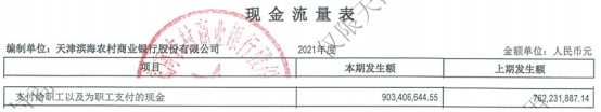 2021年,天津滨海农商银行支付给职工以及为职工支付的现金为9.03亿元,上年同期为7.62亿元。