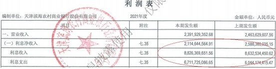 2021年,天津滨海农商银行利息净收入为21.15亿元,上年同期为25.88亿元;其中,利息收入为88.26亿元,上年同期为86.33亿元;利息支出为67.12亿元,上年同期为60.44亿元。