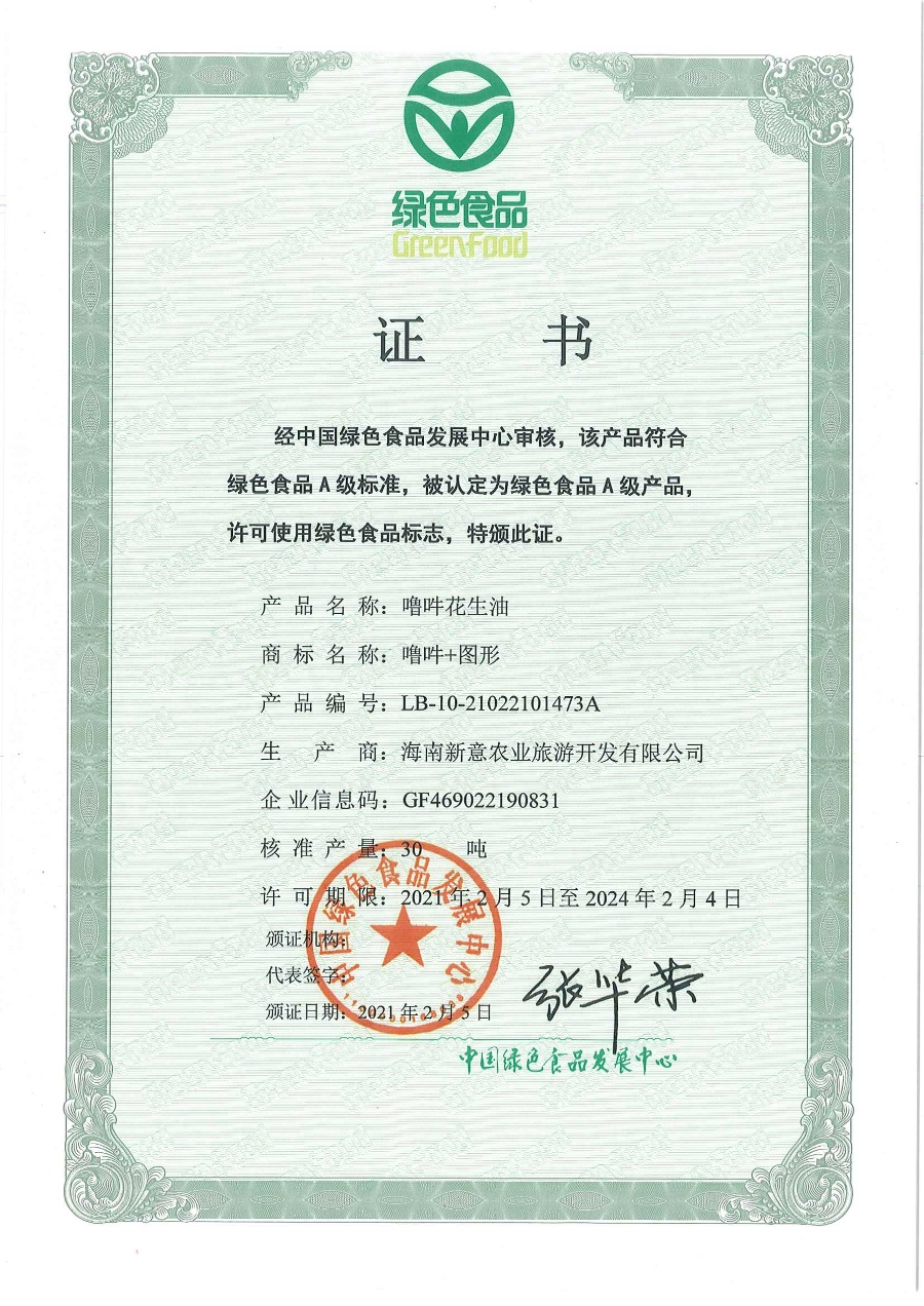 绿色花生油认证证书。噜吽供图