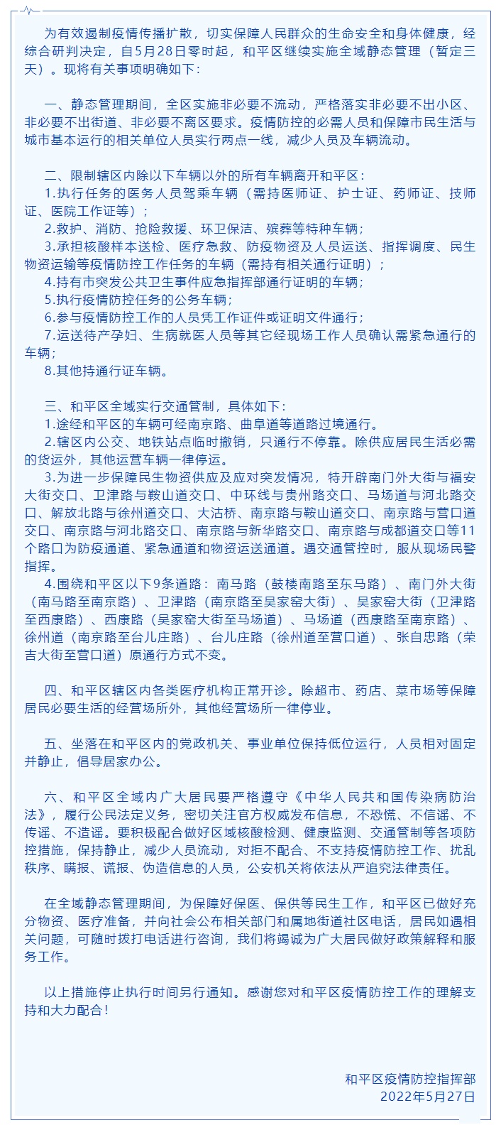 为有效遏制疫情传播扩散,切实保障人民群众的生命安全和身体健康,经综合研判决定,自5月28日零时起,天津和平区继续实施全域静态管理(暂定三天)。现将有关事项明确如下: