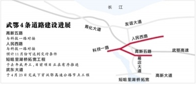 根据省里对武鄂道路“硬联通”提出的要求,葛店开发区加快推进人民西路、高新五路、武东大道和短咀里湖桥拓宽项目等4条道路建设,打通“断头路”,畅通“瓶颈路”,尽早实现武汉鄂州两地道路连通。
