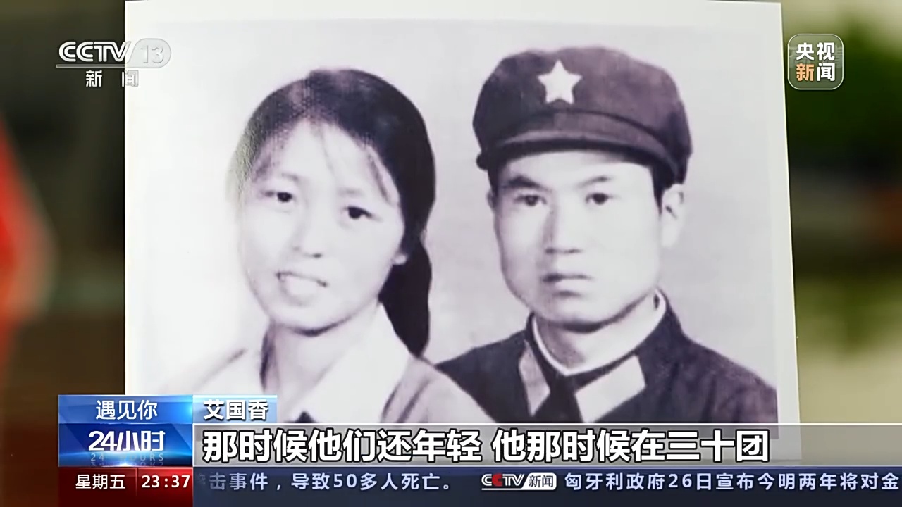 东风照相馆老板 艾国香:这是八几年的相片了这是,那时候他们还年轻,他那时候在三十团,他刚从陕西来,在我们家照的,第一张相片在我们家照的,照这个相片的时候,我让他这样子他不愿意,硬是把他这样子拽过来了,他不好意思。