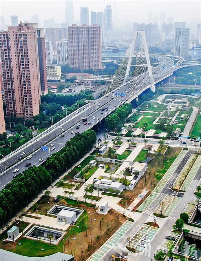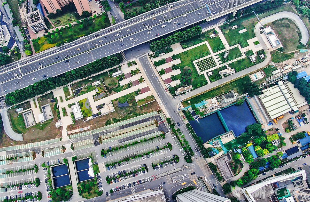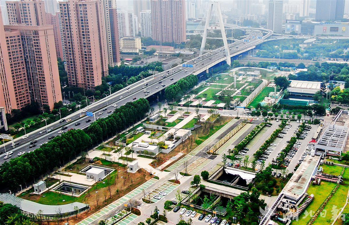 5月27日,鸟瞰武汉市黄孝河铁路桥地下净水厂项目。该项目地下的净水厂部分机组已试运行,地上的绿化公园部分已建成开放。