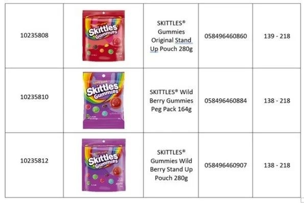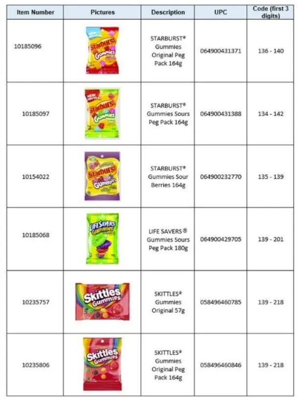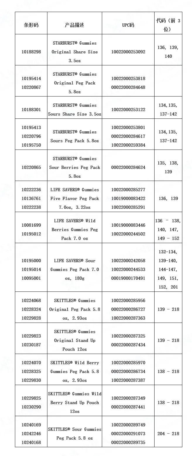 1.暂不通过任何渠道购买玛氏箭牌糖果有限公司正在召回特定批次的SKITTLES软糖、STARBURST软糖和LIFE SAVERS软糖产品(具体产品信息请见附表)。