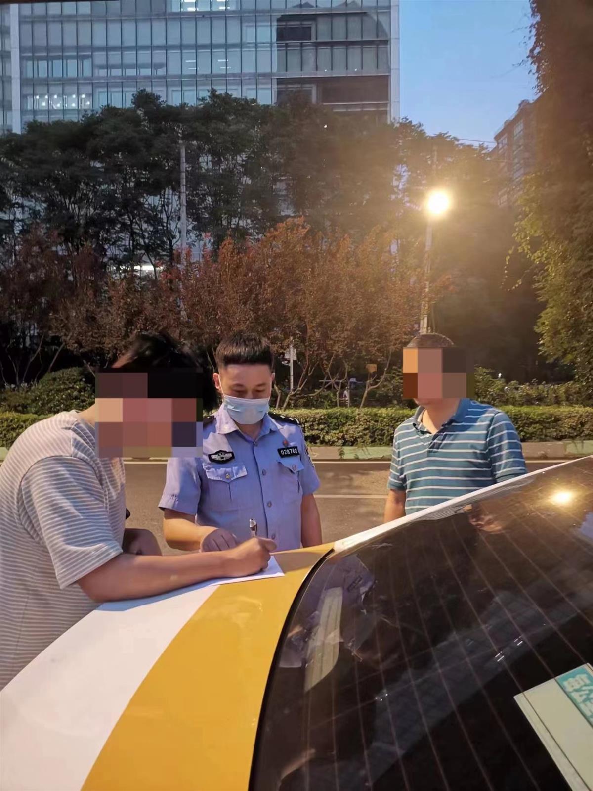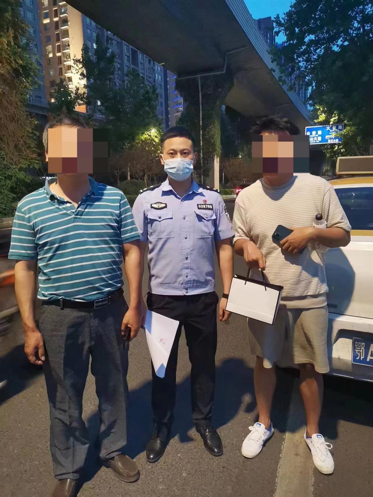 武汉市公安局硚口区分局新世界警务站民警接警后,按照“1、3、5分钟快反圈”工作要求,迅速赶到事发地了解具体情况。“你别急,我们查询条件有限,马上送你去派出所,大家一起找。”警车还在路上,警务站民警已将情况通报给宝丰街派出所值班民警赵闯。刚到派出所,赵闯就已通过调看城市视频监控,查找到出租车号牌,联系上该车驾驶员方师傅。双方约定,在江岸区三阳路见面。