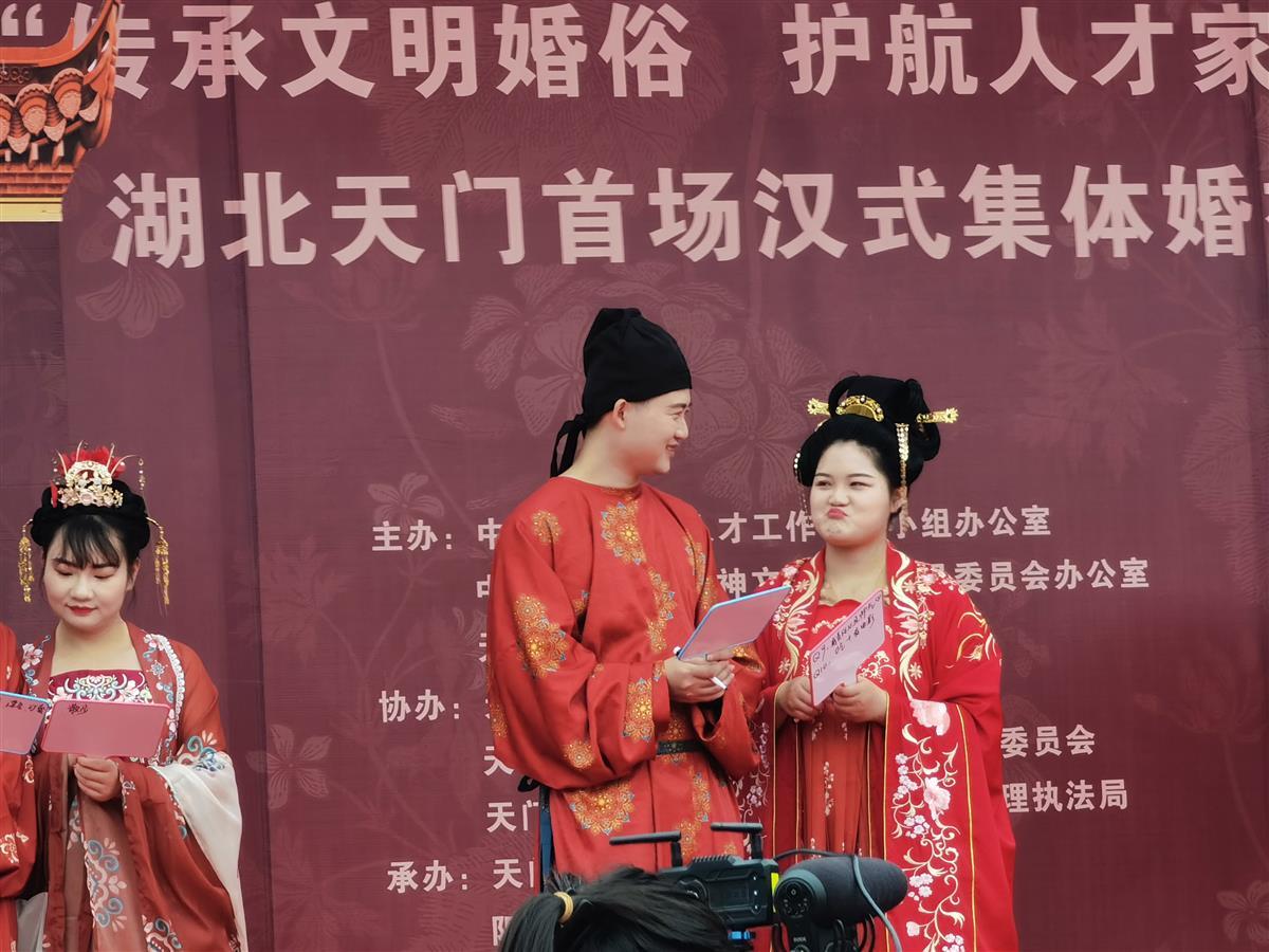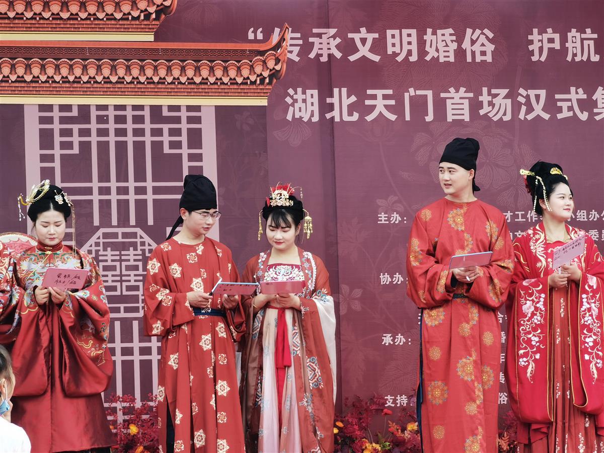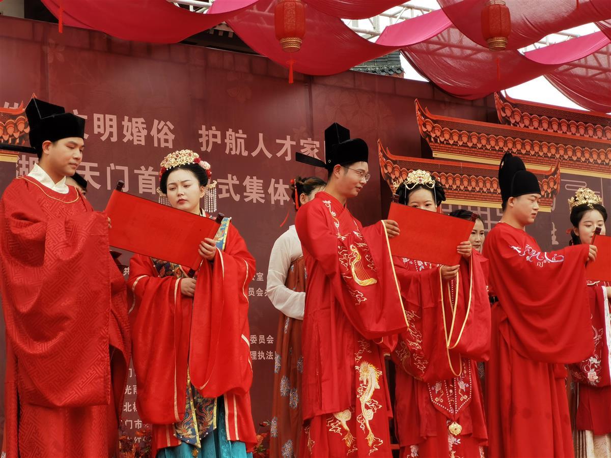 湖北日报讯(通讯员罗菊)5月28日,在天门市陆羽故园茶经楼前,随着阵阵鼓声响起,天门首场汉式集体婚礼正式启动。10对新人身着汉服,在这场别具一格的“集体汉婚”中,穿越千年浪漫。