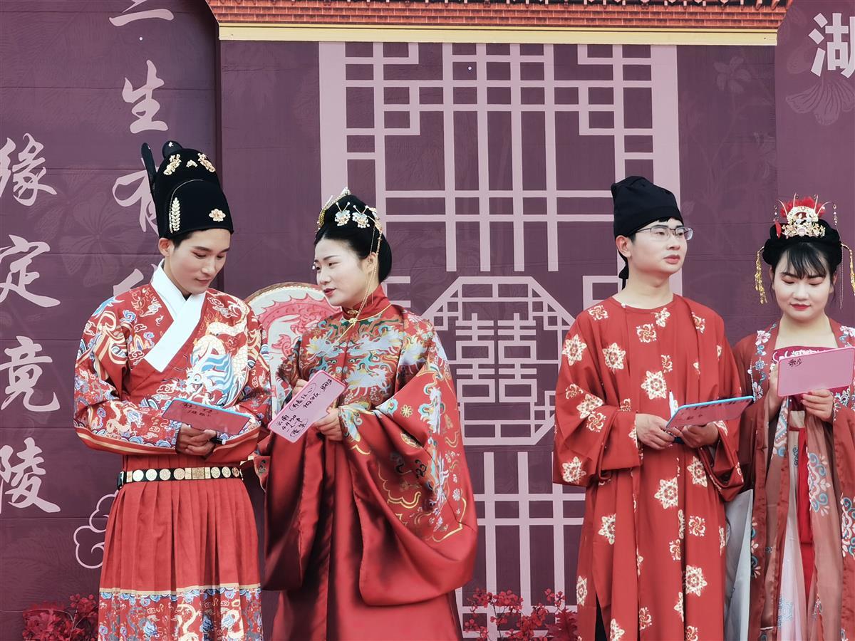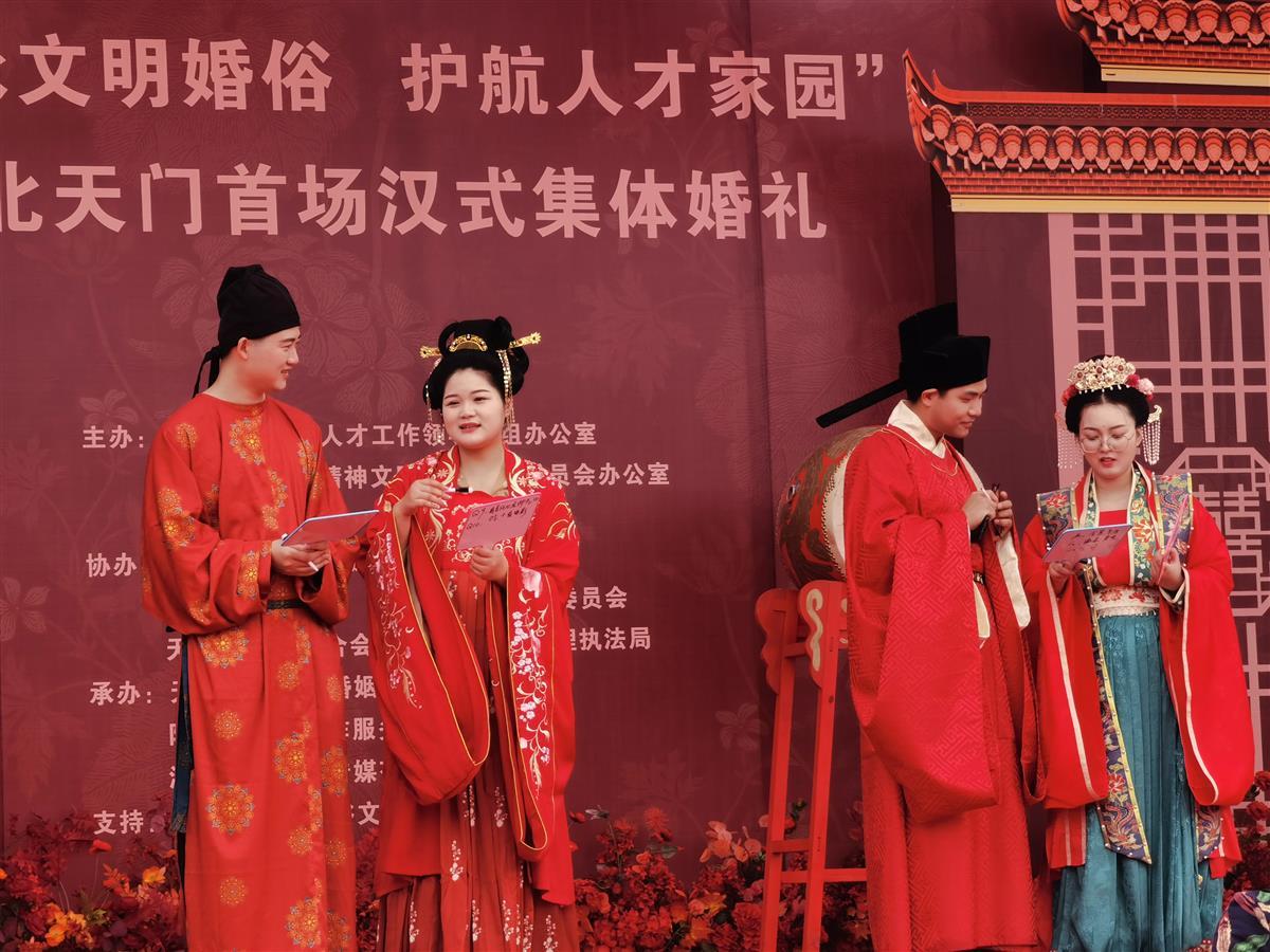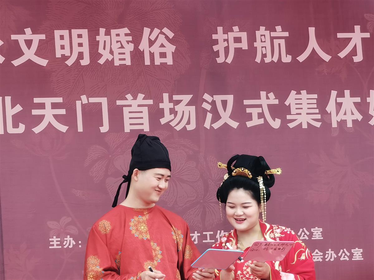 湖北日报讯(通讯员罗菊)5月28日,在天门市陆羽故园茶经楼前,随着阵阵鼓声响起,天门首场汉式集体婚礼正式启动。10对新人身着汉服,在这场别具一格的“集体汉婚”中,穿越千年浪漫。
