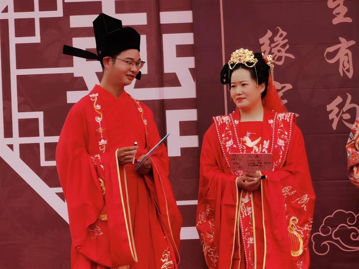 婚礼现场,惊艳的传统服饰让观众仿佛重回千年之前,新人们还展现了不同朝代的礼仪,如敛衽礼、肃拜礼、叉手礼、万福礼、揖礼,以及传统婚礼中的却扇、沃盥、同牢、合卺、结发等仪轨,凸现出礼仪之邦的文明气韵。新人们还获赠了茶礼等新婚礼包和集体婚礼特别婚书。