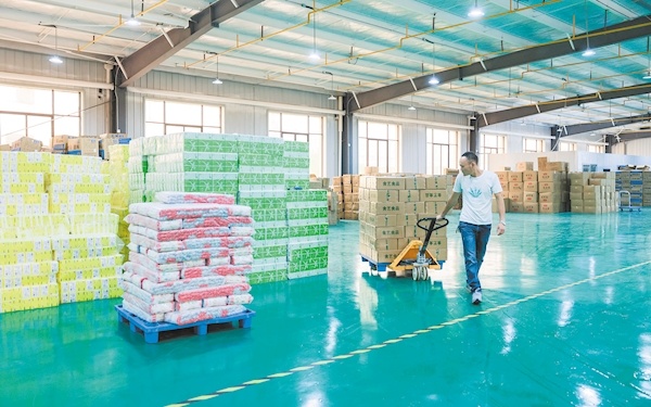 5月27日,峡谷云村公司物流仓库,工人在转运网上销售的产品。