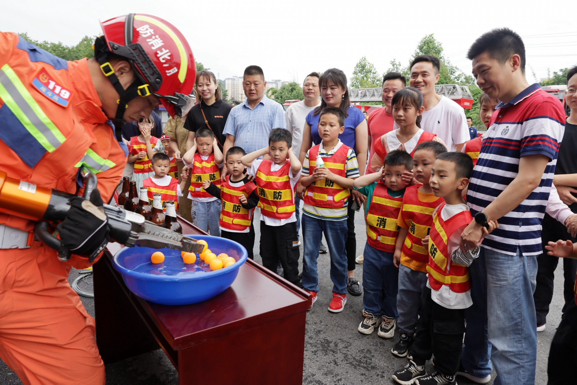 在“技能展示”环节,消防救援人员家属及其子女观看了消防救援人员开展液压剪夹乒乓球、无齿锯切钢丝等技能展示。现场不时传来小朋友们阵阵惊叹声。