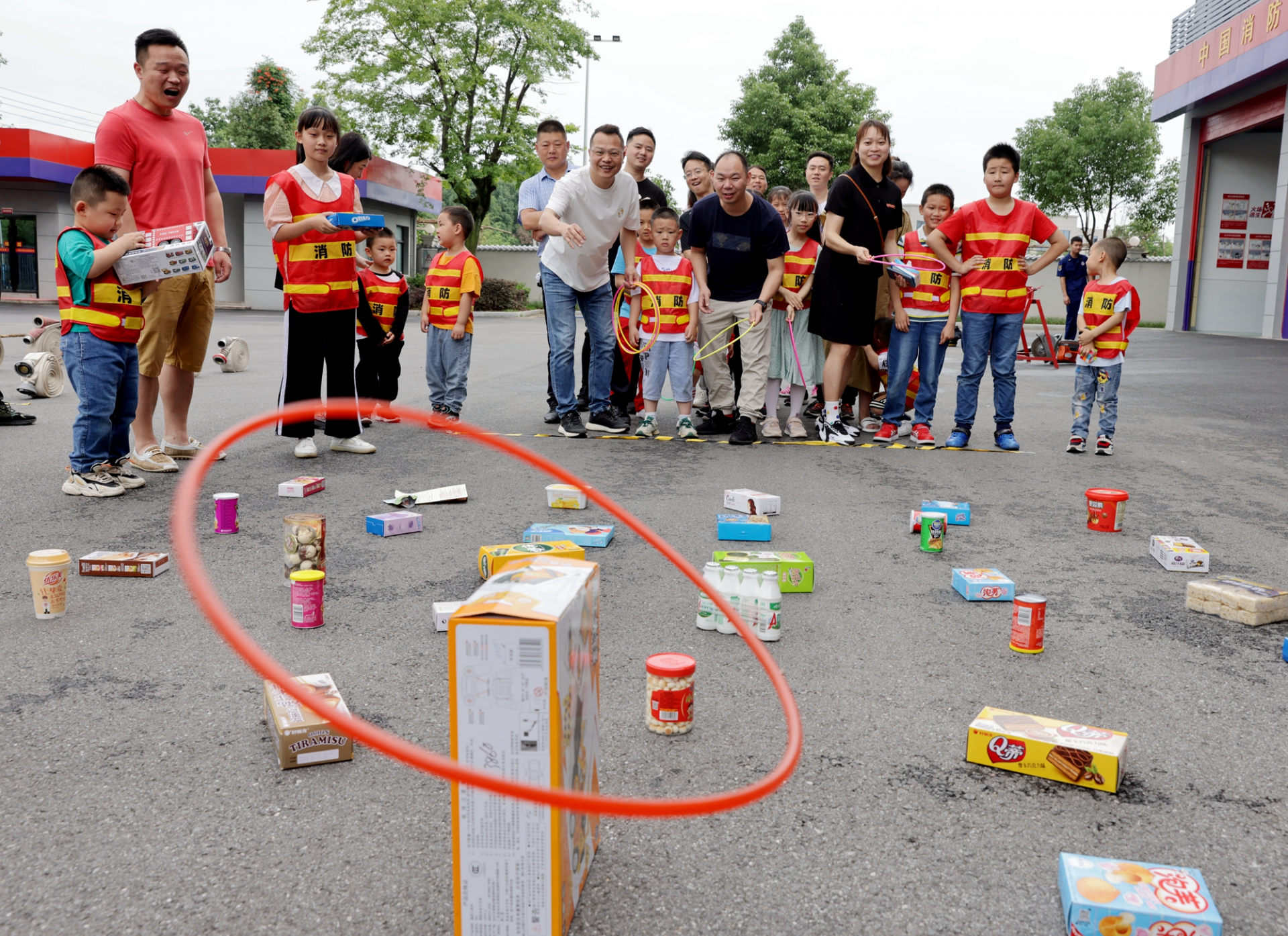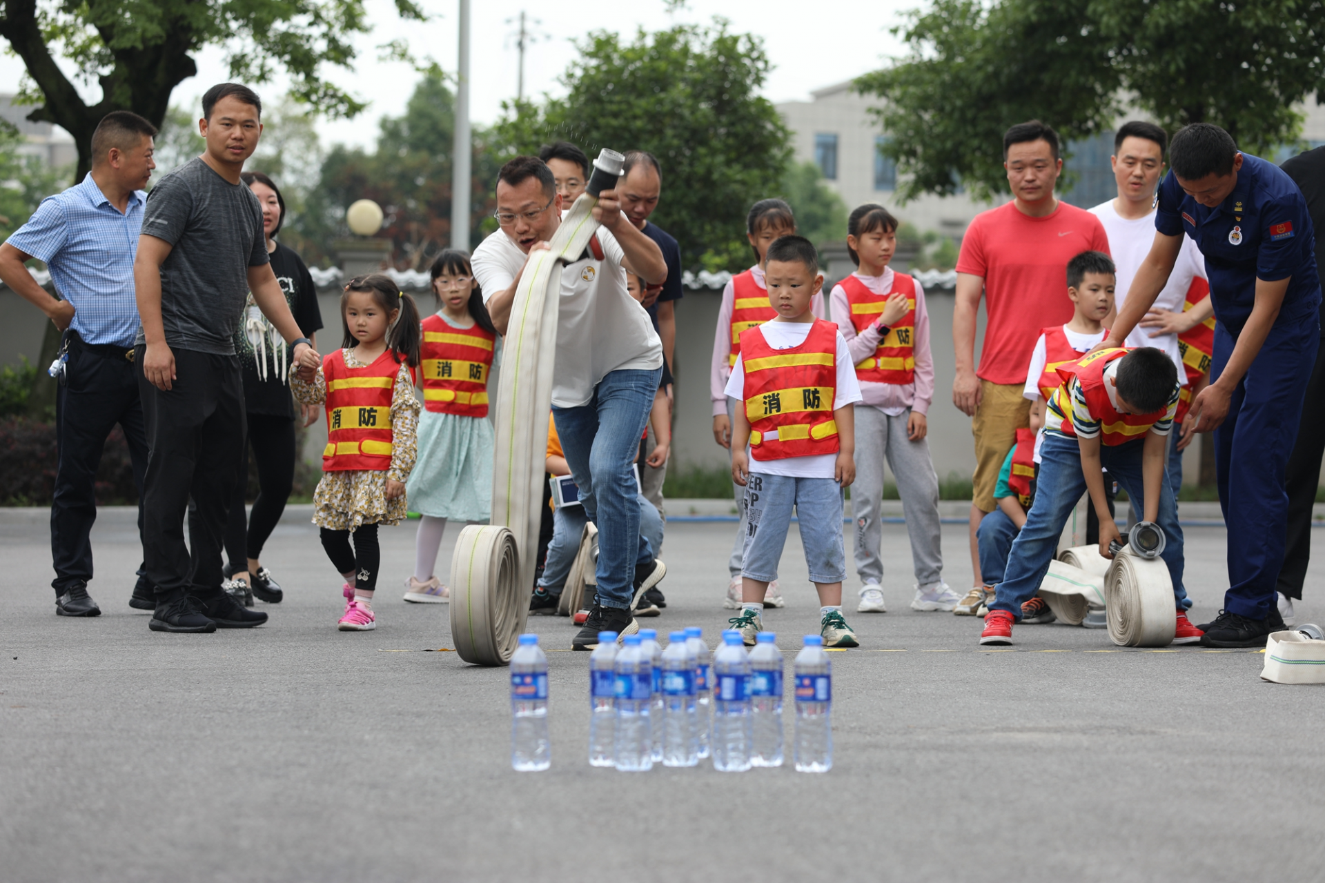 在亲子游戏“抛撒消防水带、背娃赛跑、拔河、套圈”中,小朋友们和父母互相配合,进一步加强了亲子之间的协作,同时让小朋友获得了赢取礼物争取荣誉的幸福感,小朋友们在欢声笑语中学习了消防知识和消防技能。