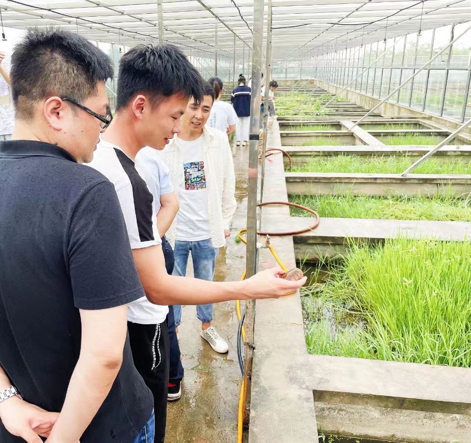 陈瑞亮与指导老师、技术人员在养殖基地。