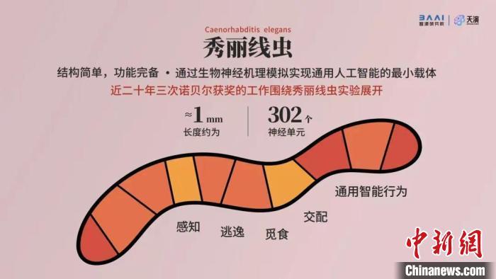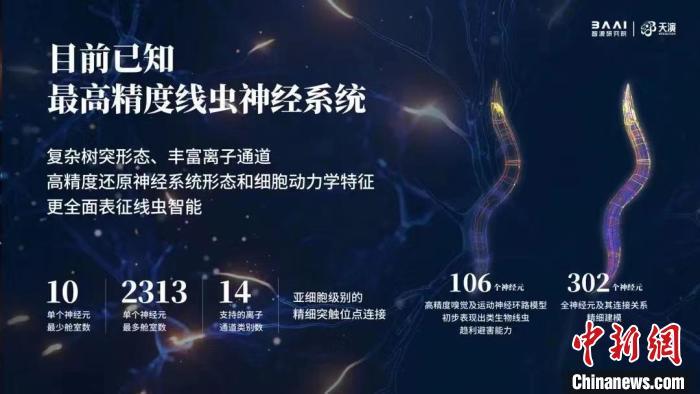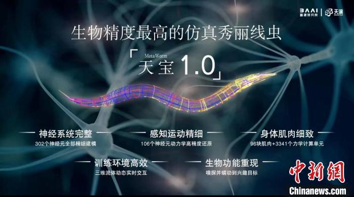 中新网北京5月31日电 (记者 孙自法)2022北京智源大会5月31日线上开幕,大会发布一项重要人工智能(AI)研发进展——目前生物精度最高、模拟秀丽线虫全部302个神经元及连接关系的智能线虫“天宝1.0”(MetaWorm)已诞生,这一成果因其被称为“迈出智能生命关键一步”而备受瞩目。